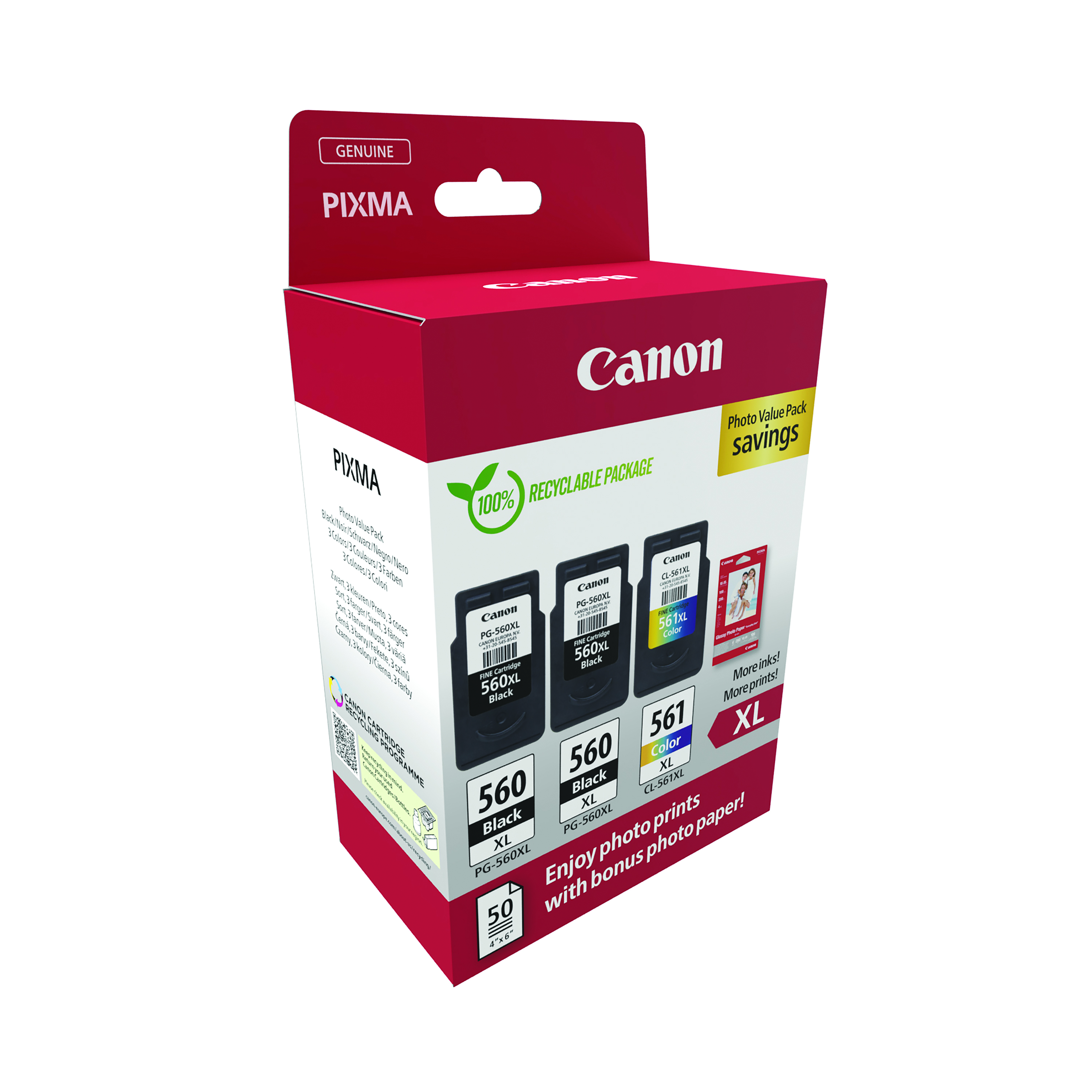 This Canon PG-560XL x2/CL-561XL high yield inkjet cartridges, with photo paper value pack is your convenient solution to affordable printing. It includes two packs of the 14.3ml PG-560XL High Yield Black Ink Cartridges, each of which print up to 400 pages and one pack of the 12.2ml CL-561XL High Yield Colour Ink Cartridge for printing up to 300 pages. The pack also includes 50 sheets of 10 x 15cm Glossy Photo Paper for producing lab-quality prints of your photos.