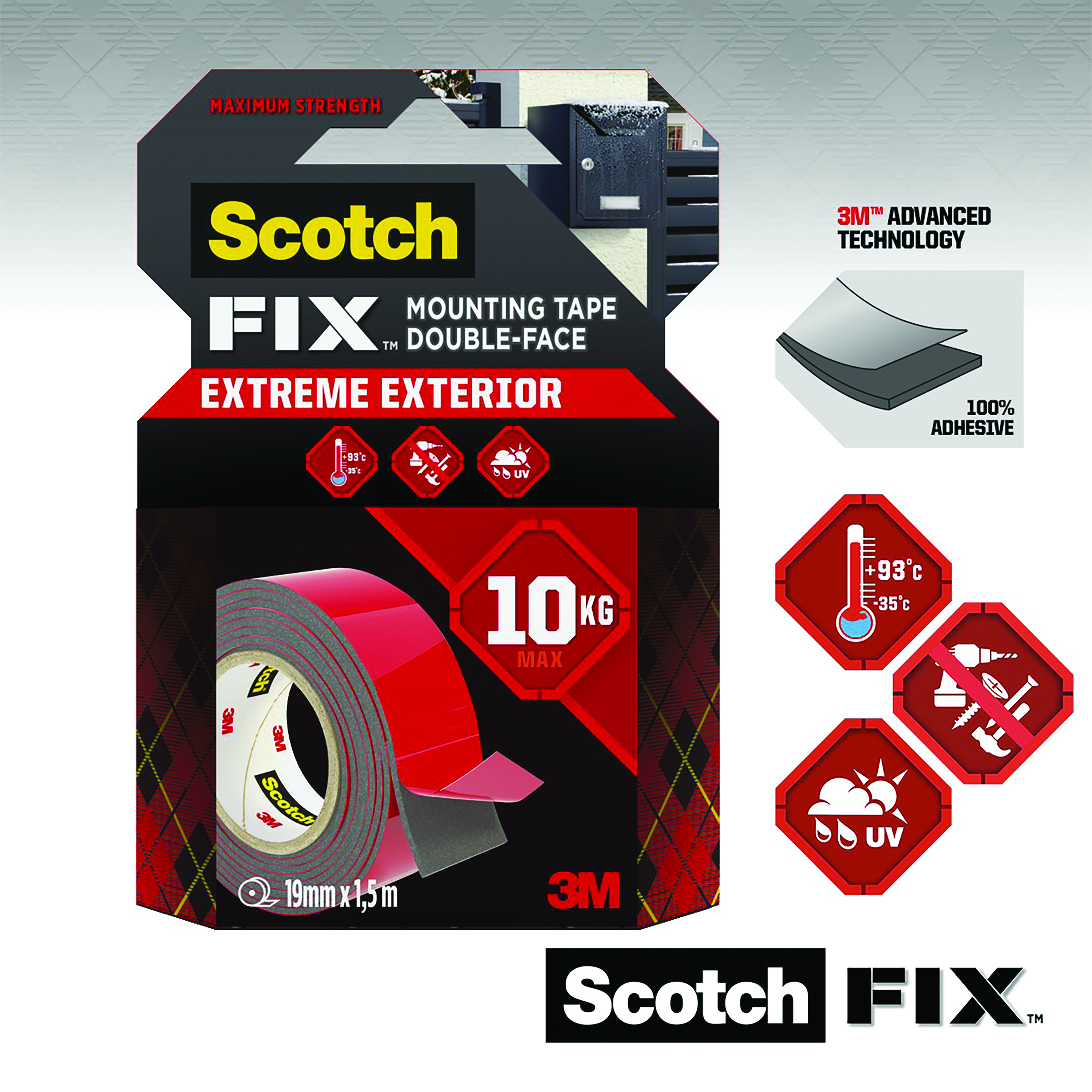 Scotch-FIX Extreme Exterior Mounting Tape with 3M advanced technology is a superior, conformable permanent tape intended for outdoor extreme use and is ideal on painted drywall, painted/finished wood, metal, acrylic, smooth stone and painted concrete. Supporting up to 13kg, it is ideal for outdoor heavy-duty applications. Suitable for mounting mailing boxes, outdoor decor, flowerpots and more. Measuring 19mm x 3m, this roll of double sided mounting tape in black and is effective in extreme temperatures and harsh weather conditions.